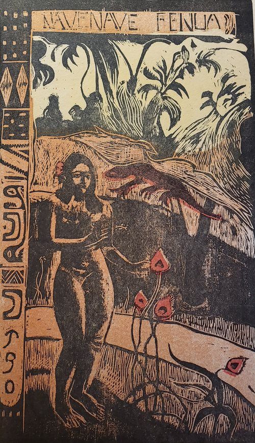 Gravure sur bois imprimée en noir, jaune, orange et rouge.