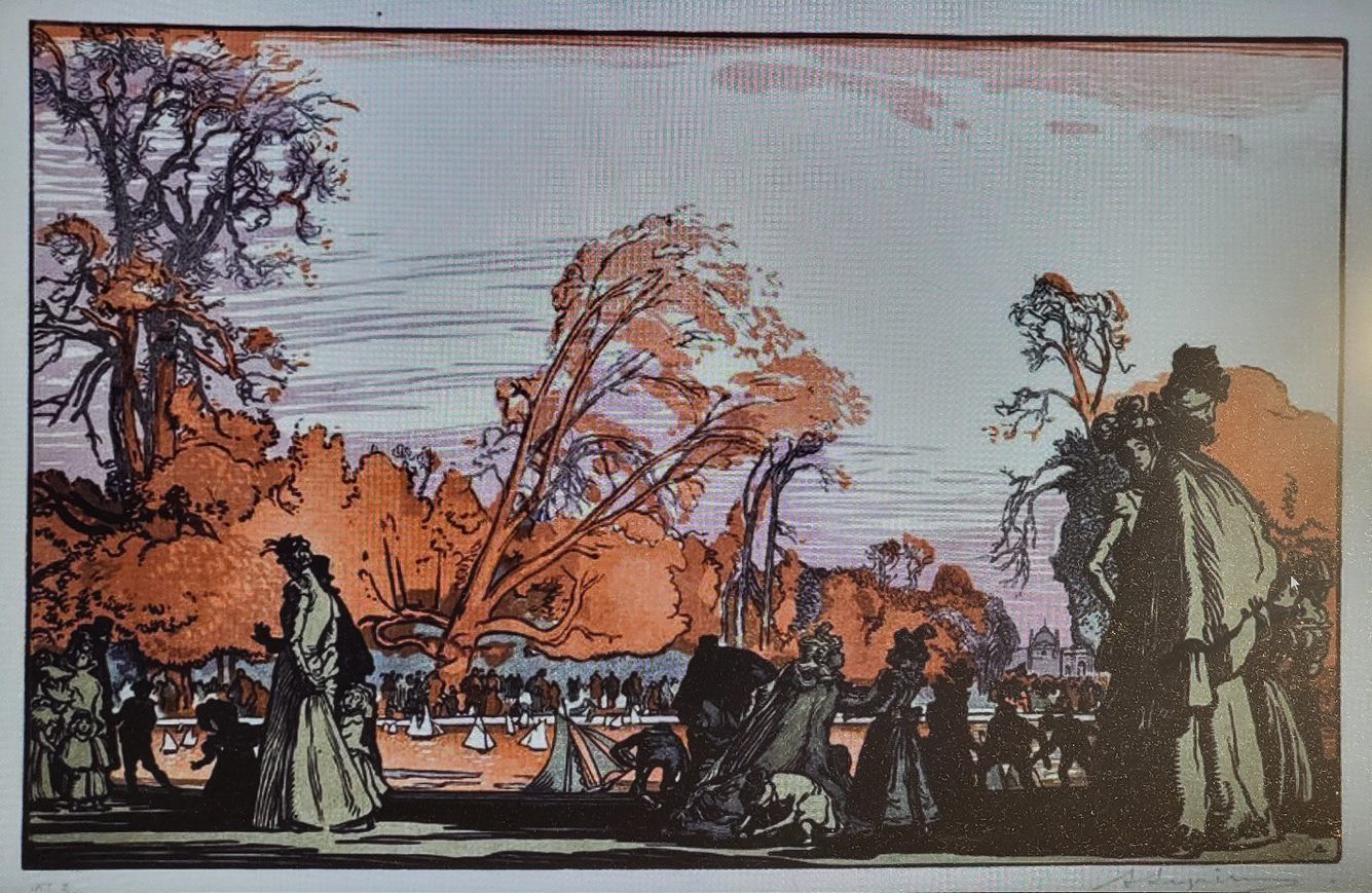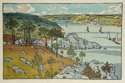 Gravure sur bois à la manière japonaise tirée en camaïeu de trois planches...